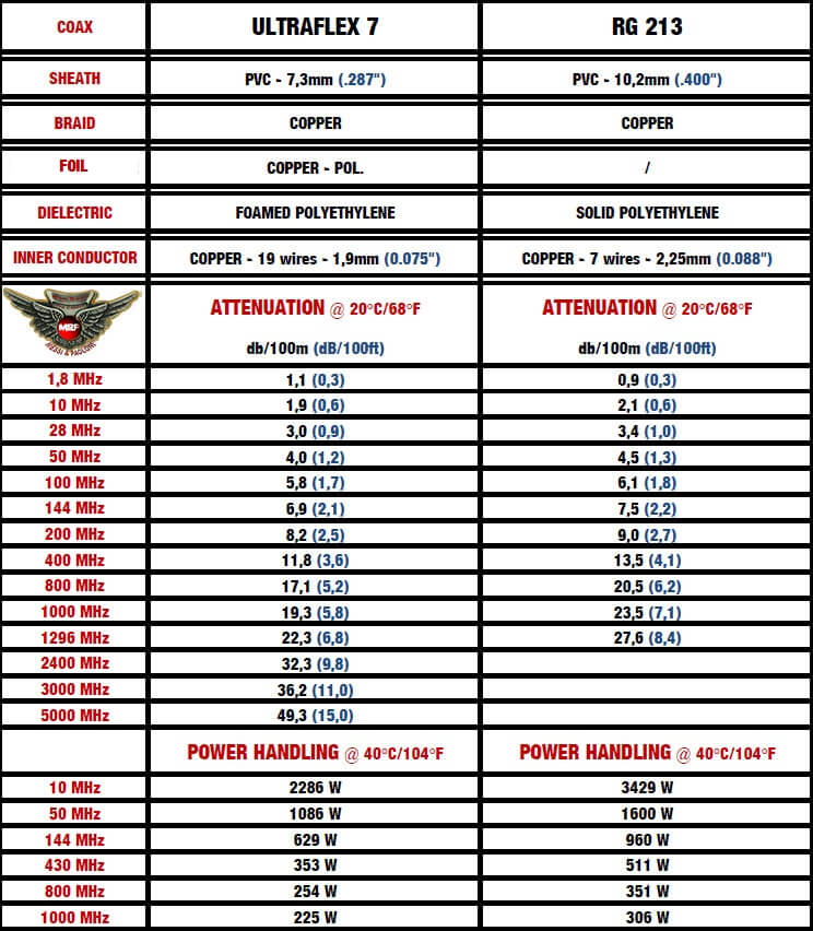 Observing the characteristics described above, you can see how our ULTRAFLEX 7  is superior to classic RG213 in every single value (starting from 28 MHz). All this despite it has a overall diameter of only 7,3mm (.287″) compared to the RG213’s 10,3mm (.400″).